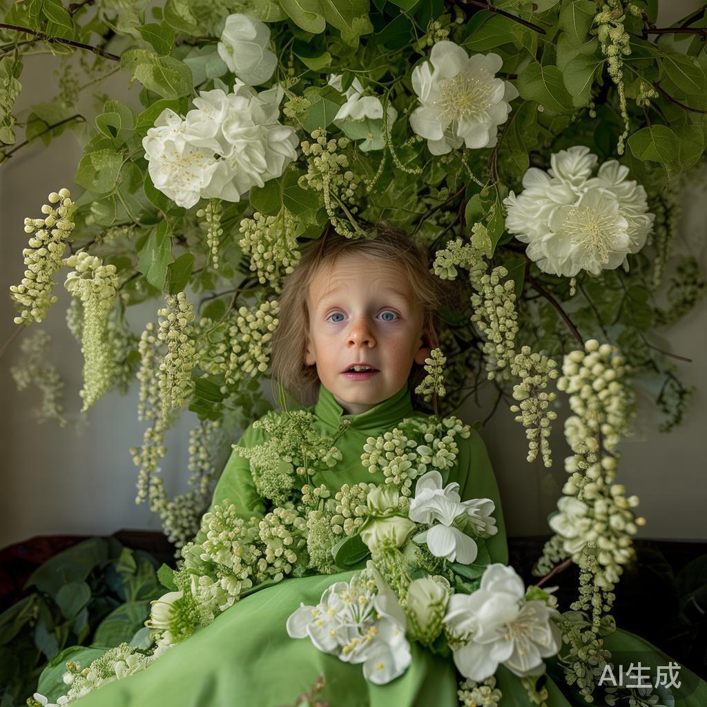 小孩向茶壶望去,惊喜地发现壶盖微微翘起,几朵洁白的新鲜接骨木花从里面冒出来,树枝往外延展,让整个房间都弥漫着诱人的香气。在这棵树的中央坐着一位温婉的老太婆,她穿着跟接骨木一样绿色的奇特衣裳,身上还挂满了大朵大朵的白花,看第一眼的时候,说真的,还真难分清楚她的衣服是布做的还是活生生的绿叶和花儿。